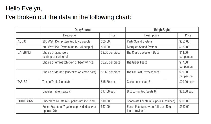 | According to the Administrative Assistant, audio costs are not the only determining factor in choosing one event planning service over another. | ||