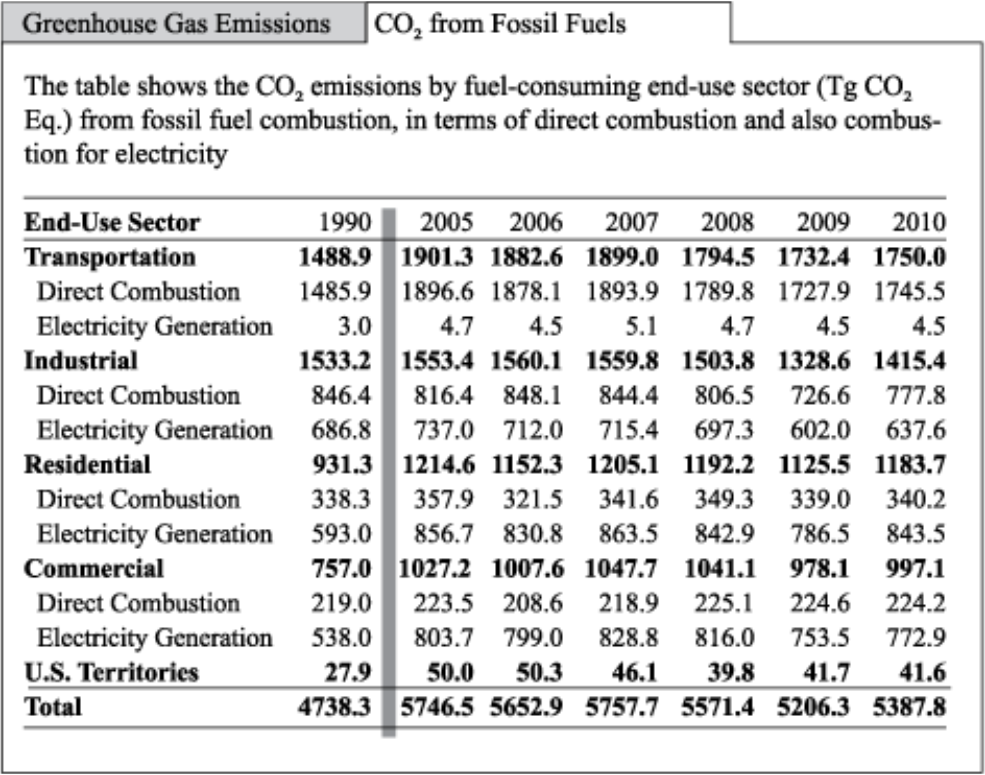 | In 2010, U.S. greenhouse gas emissions, not counting CO2 emissions from fossil fuel combustion for electricity generation, were 4563.3 Tg CO2 Eq. | ||