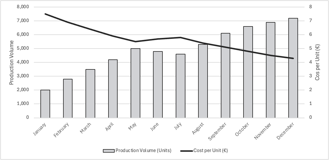 The bar chart shows the total production volume (in units) for each month (measured on the left vertical axis), while the line graph shows the corresponding cost per unit (in euros, measured on the right vertical axis).