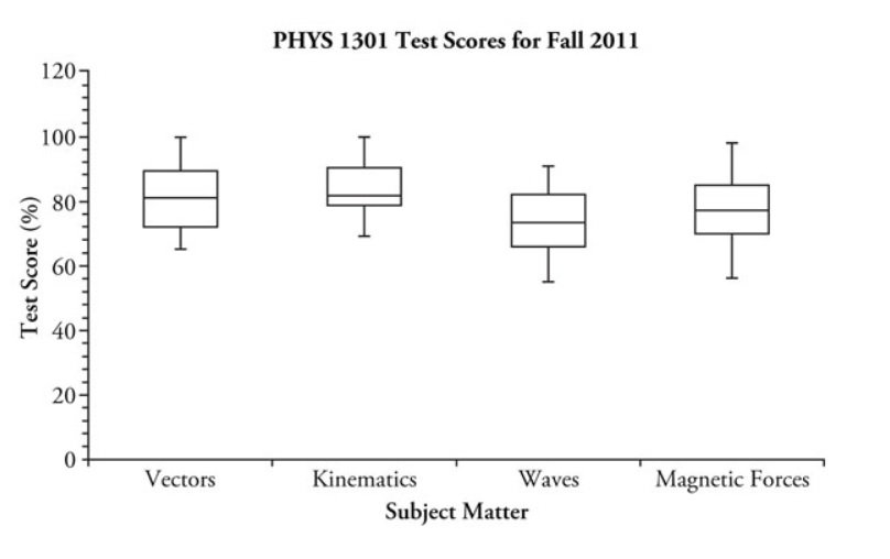 The graph above is a box plot with four measurements, each representing the scores of 20 students, measured over the Fall 2011 semester of PHYS 1301. Each box represents the middle 50%, also known as the interquartile range, and the lines extending vertically upwards or downwards represent the top 25% and bottom 25%, respectively. The solid line inside the box represents the median test score for each measurement.