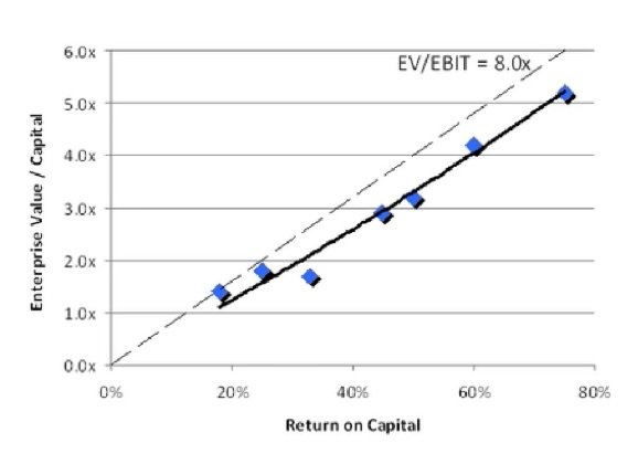 The graph here is a scatter plot of 7 points, each representing a company's return on capital and EV/Capital ratio in the fictitious Widgets industry. Return on Capital is defined as EBIT (Earnings Before Interest and Taxes) divided by Capital (or EBIT/Capital). The slope provided is y-axis over x-axis; here the slope is (EV/capital) / (EBIT/captial) = EV/EBIT. An EV/EBIT slope of 8.0x is drawn as a dotted line.
