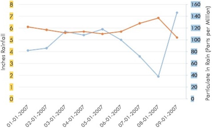The graph illustrates both the daily amount of rainfall in inches and the amount of pollution in that rain measured in parts of particulate per million parts of water. The lines for each are colour-coded to associate them with the appropriate y-axis. The x-axis denotes the dates in MM-DD-YYYY format.
