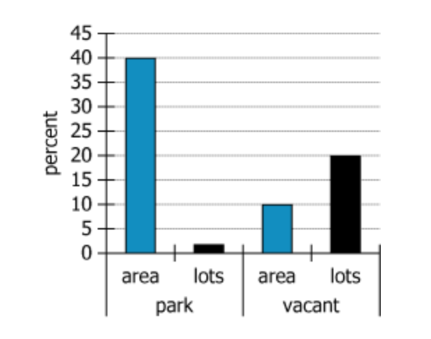 The graph is part of a report about land use in a certain region. The chart shows, for each of the designations park and vacant, the percent of the region's total area that has that designation and the percent of the total number of lots in the region that have that designation. All land in the region is divided into lots.