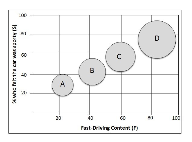 The graph represents the results of a survey taken by focus groups each shown a different version of an upcoming commercial for a sports car. Each version had a different amount of content showing the car in fast-driving scenes. After the group viewed the commercial, each member was asked two questions: "Did you feel that the car was sporty?" and "How likely are you to purchase this car?" The position of the circles on the left indicate how much fast-driving content (F) was in the version of the commercial show and the % of viewers who found the car to be 'sporty' (S). The relative size of the circles indicates how likely the members of the group were to purchase the car (L). The bigger the circle, the more likely they were to purchase.