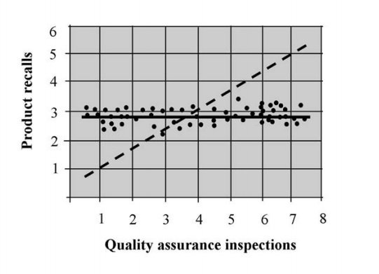 The graph shown is a scatter plot with 60 points, each representing the number of quality assurance inspections conducted on products manufactured at 60 different factories, and the corresponding numbers of product recalls experienced by each factory. Each factory conducted a consistent number of quality assurance inspections on all products produced during a one-year period, and the number of product recalls was measured over that same period. The solid line is the regression line, and the dashed line is the line through the points (1, 1) and (7, 5). Select the best answer to fill in the blanks in each of the statements below based on the data shown in the graph.