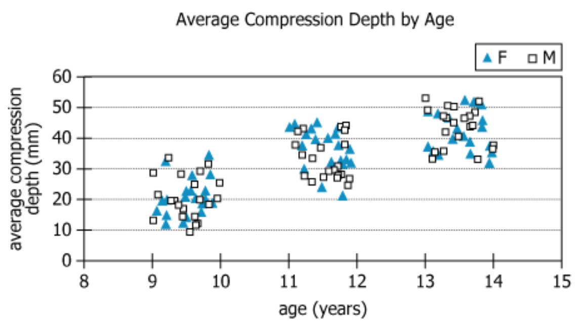 The graph shows data for 40 children, half of whom were male (M) and half of whom were female (F), in each of three age groups: at least 9 but less than 10 years old, at least 11 but less than 12 years old, and at least 13 but less than 14 years old. These children were taught to perform chest compressions used in cardiopulmonary resuscitation (CPR). For CPR, ideal compression depth is 40 to 50 millimeters (mm). The children used a practice mannequin with sensors that recorded the average (arithmetic mean) depth achieved by each child. The results are plotted on the graph.