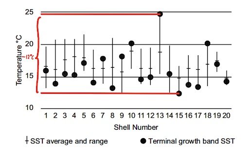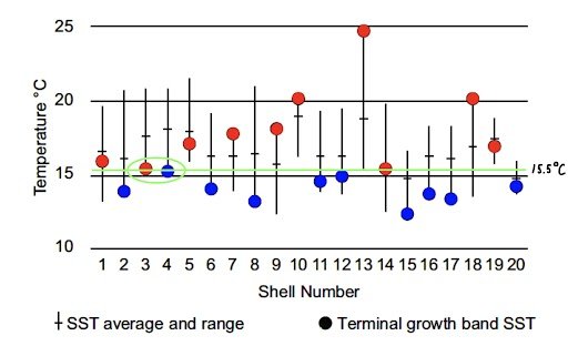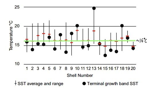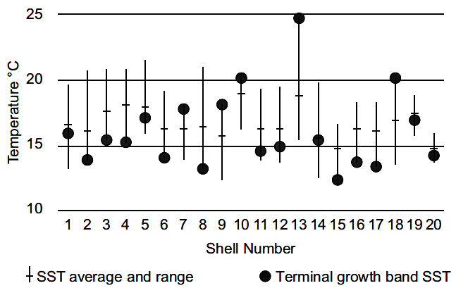 The graph shows the minimum, maximum, and mean sea-surface temperatures (with the mean indicated by —), as well as the terminal growth band SST (indicated by •) recorded for 20 sampled shells. The terminal growth band SST refers to the sea-surface temperature at the time the shell stopped growing.