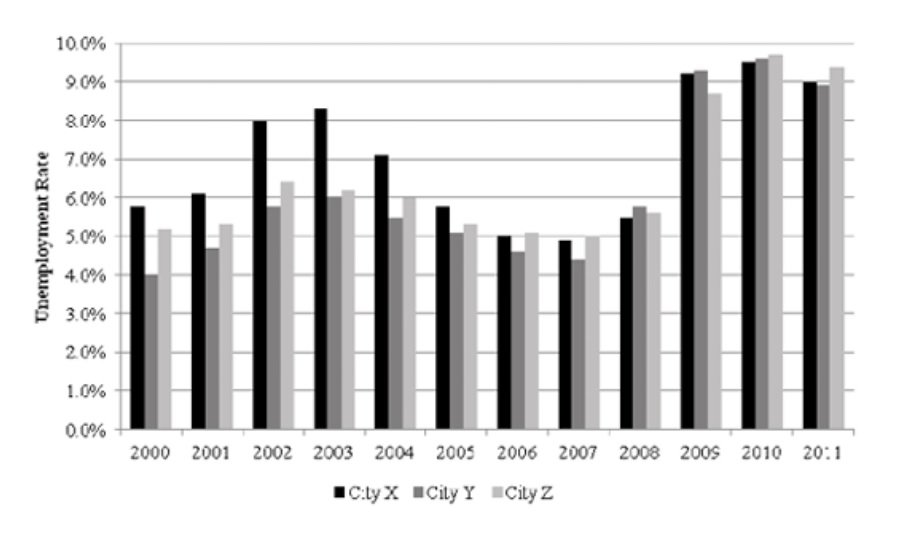 Don’t waste time trying to calculate exact averages. Rather, think about the different cases in which City X’s unemployment rate would have been greater than the average unemployment rate of the other two cities. One such case is when City X’s rate is greater than either of the other two rates. This happened every year from 2000 to 2005. Next, City X’s unemployment rate will be greater than the average unemployment rate of the other two cities when City X’s rate is between the two other rates, but closer to the larger one of the two. This happened in 2006, 2007, and 2009. In 2011, City X’s rate was between the other two but closer to the lower of the two, while in 2008 and 2010 City X’s rate was the lowest of the three. Thus, in all but these three years (that is, in a total of 9 years), City X’s rate was greater than the average of the other two rates.
