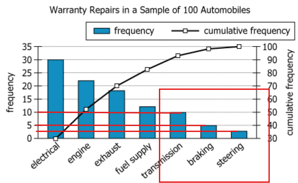 What I did was subtract the two cumulative sums: transmission + braking + steering = (electrical + engine + exhaust + fuel supply + transmission + braking + steering) - (electrical + engine + exhaust + fuel supply) = 100% - cumulative sum at point "fuel supply" = 100% - 82% = 18%.