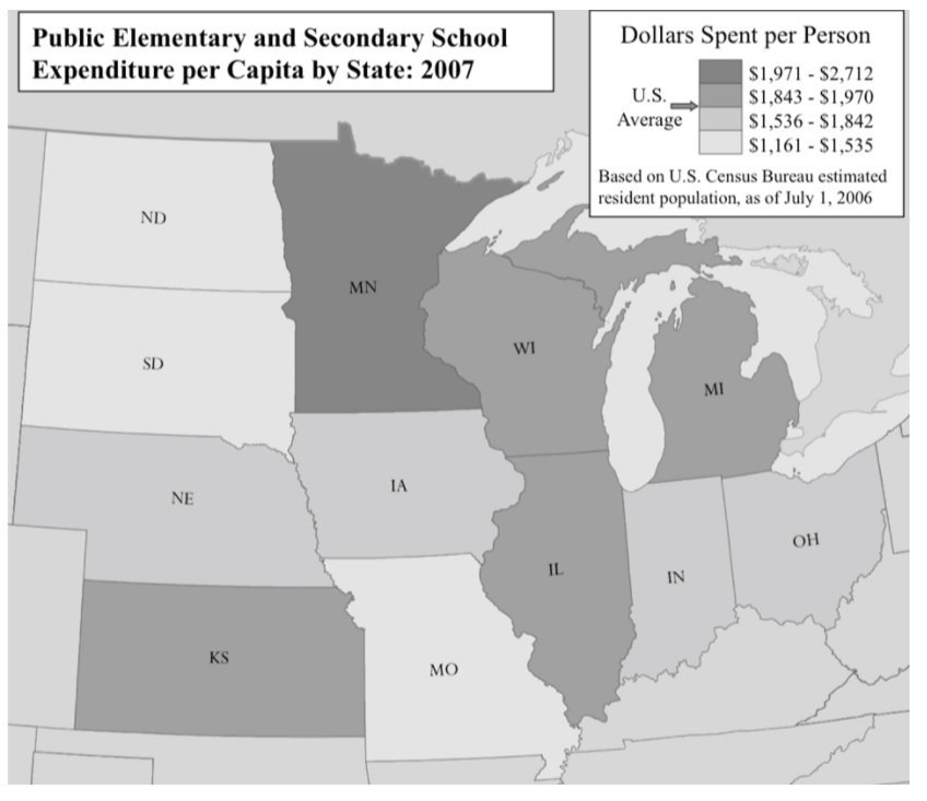 The graphic indicates the range of spend, per person, for public elementary and secondary school education in various Midwestern states in the United States in 2007. Use the drop-down menus to complete each statement according to the information presented in the diagram.