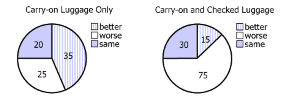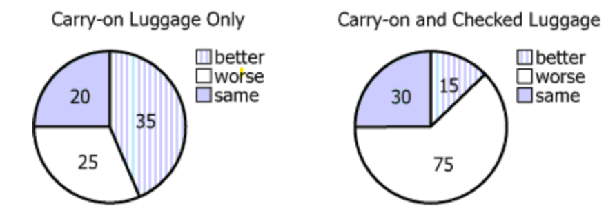 Carry on total = 20+25+35=80 Checked +carry on respondents total = 30+75+15=120 . Total responses =120+80= 200. Total of those who had same experience from carry on respondents + (Checked and carryon )= 35+15=50. Prob =50/200=0.25
