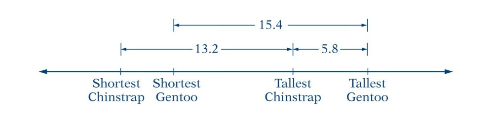 Choice C provides information about another center of the data—the average. You are given that the average height of the Gentoos is 4.6 centimeters greater than that of the Chinstraps. However, like Choice B, the statement gives no information about how spread out the data are around that center. Again, it is possible for two different sets of data to have the same average but have very different ranges. Examples similar to the two examples above can be constructed that satisfy all of the information in the question and in Choice C but have different ranges for the heights of all the penguins. Therefore,