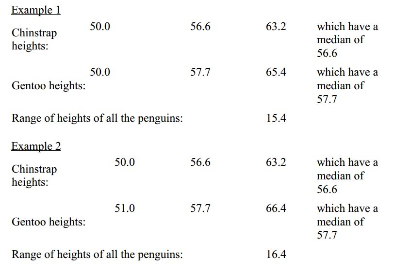 It is possible to construct examples of heights of penguins that satisfy all of the information in the question and in Choice B but have different ranges for the heights of all the penguins. Here are two such examples, each of which has only three Chinstraps and three Gentoos. Although the examples are small, they illustrate the fact that the range of the heights of all the penguins can vary. In both examples, the range of Chinstrap heights is 13.2 centimeters, the range of Gentoo heights is 15.4 centimeters, and the difference between the median heights is 1.1 centimeters.