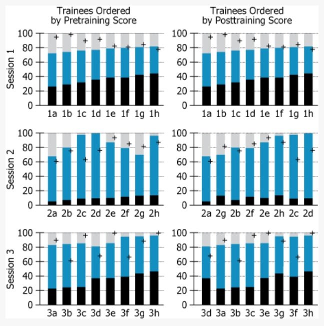 | For at least one trainee, the posttraining score was greater than 3 times the pretraining score. | ||