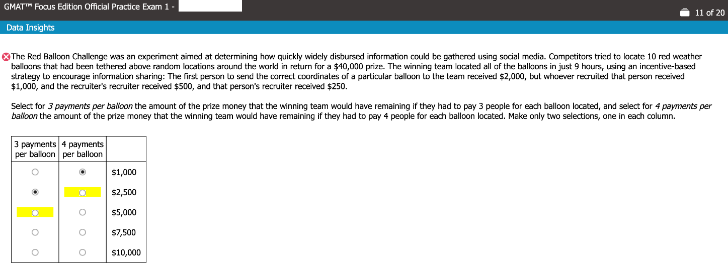 Select for 3 payments per balloon the amount of the prize money that the winning team would have remaining if they had to pay 3 people for each balloon located, and select for 4 payments per balloon the amount of the prize money that the winning team would have remaining if they had to pay 4 people for each balloon located. Make only two selections, one in each column.There's a little trick to this question, in that "9 hours" is thrown into the passage to possibly confuse us into using 9 rather than 10 in our calculations.