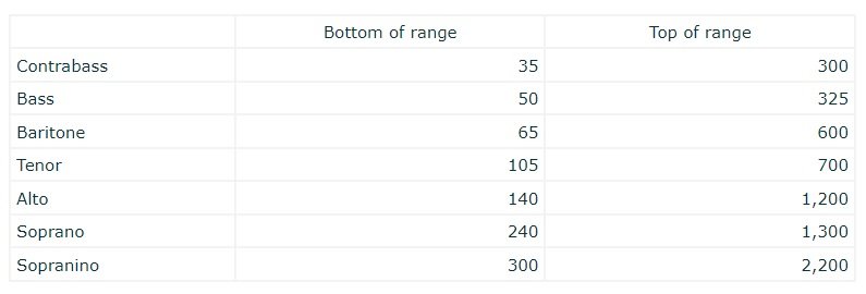 | Saxophones with lower-frequency ranges tend to have smaller ranges, measured in Hz. | ||