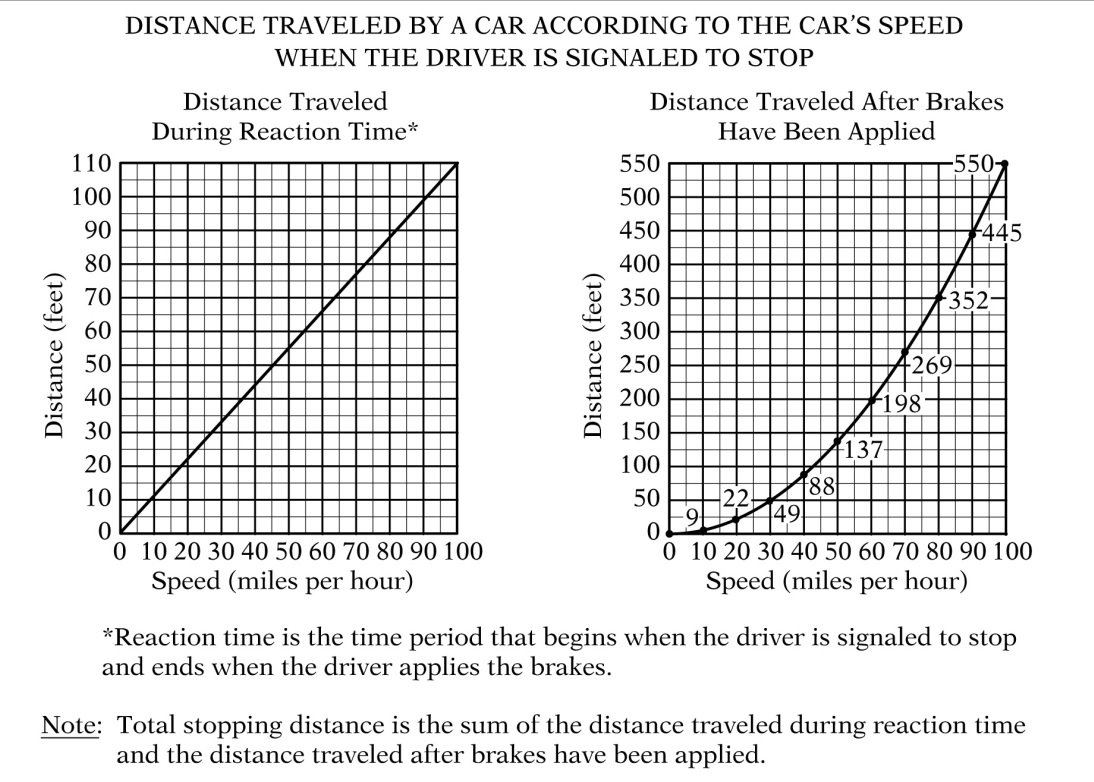 The graph on the left shows the relationship between the speed of the automobile and the distance it traveled during the reaction time. Therefore, the answer to this question is found using this graph by reading the speed, in miles per hour, corresponding to a distance of 52 feet. A distance of 52 feet is