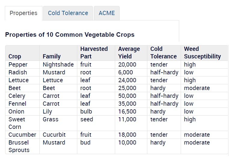 The table above provides data for 10 common vegetable crops grown in the U.S. The average yield data is given in pounds per acre for one growing period. Weed susceptibility measures the effects of weeds on the crops at three levels: high, moderate, and low. Cold tolerance is explained in the second data tab.