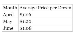 \(\frac{Eggs sold in April * Average price in April + Eggs sold in May * Average price in May + Eggs sold in May * Average price in June}{Eggs sold in April + Eggs sold in May + Eggs sold in June}\)