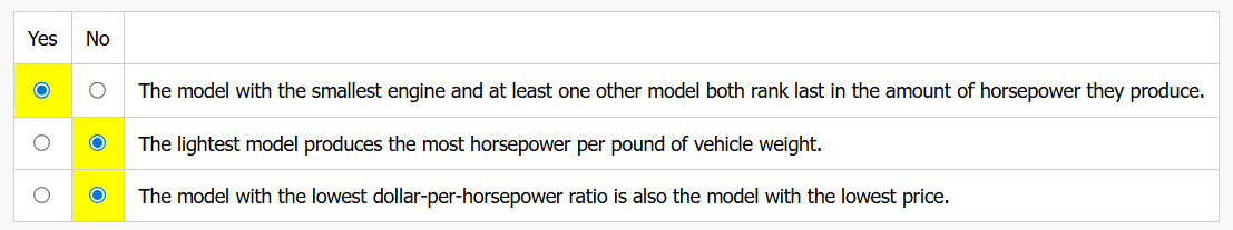 | The model with the smallest engine and at least one other model both rank last in the amount of horsepower they produce. | ||