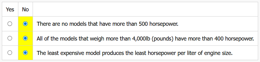 | Model | Weight (lb) | Engine size (L) | Horsepower (HP) | Price ($) | $/HP ratio |