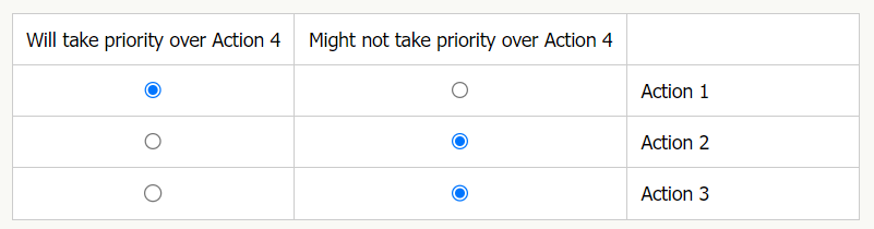 Action 1 has all three standards higher than Action 4. Hence, Action 1 will take priority over Action 4.