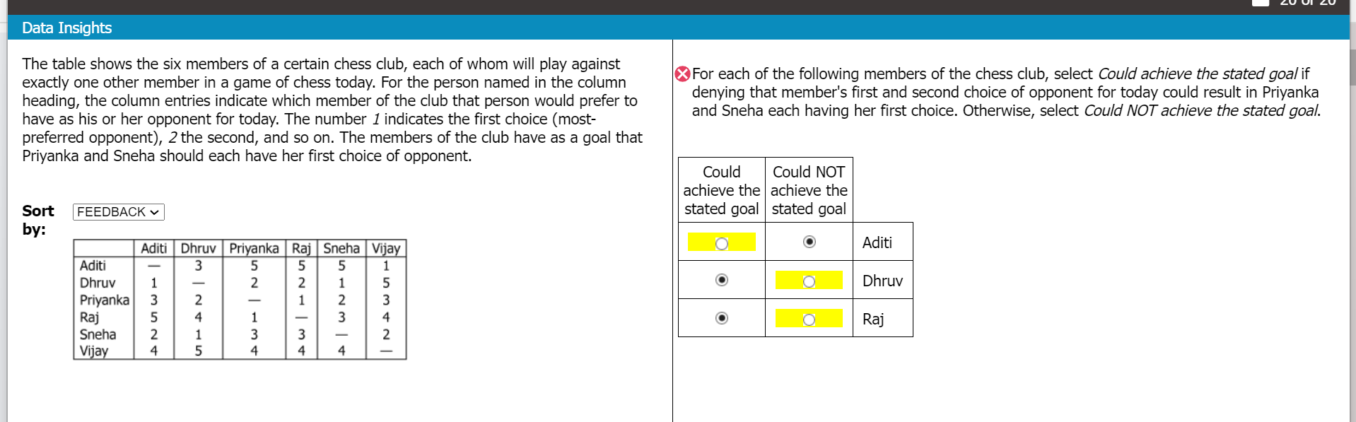 The table shows the Six members of a certain chess club, each of whom will play against exactly one other member in a game of chess today. For the person named in the column heading, the column entries indicate which member of the club that person would prefer to have as his or her opponent for today. The number 1 indicates the first choice (most- preferred opponent), 2 the second, and so on. The members of the club have as a goal that Priyanka and Sneha should each have her first choice of opponent.