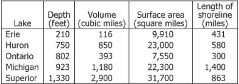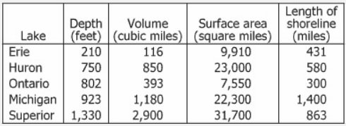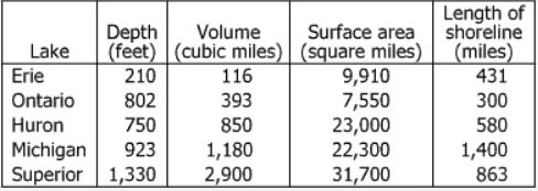 | Lake | Depth (feet) | Volume (cubic miles) | Surface area (square miles) | Length of shoreline (miles) |