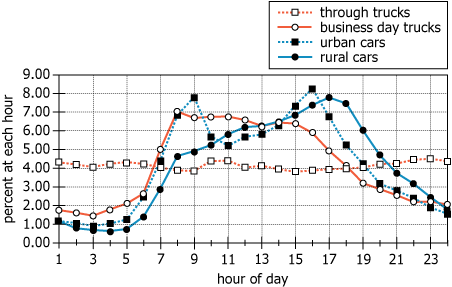 What we should know: The sum of all the points on each of the line should add up to 100. For example, tak ethe case of through trucks, the dotted orange lines. All 24 points are close to 4%, so they will add up to something greater than 24*4 or 96%.