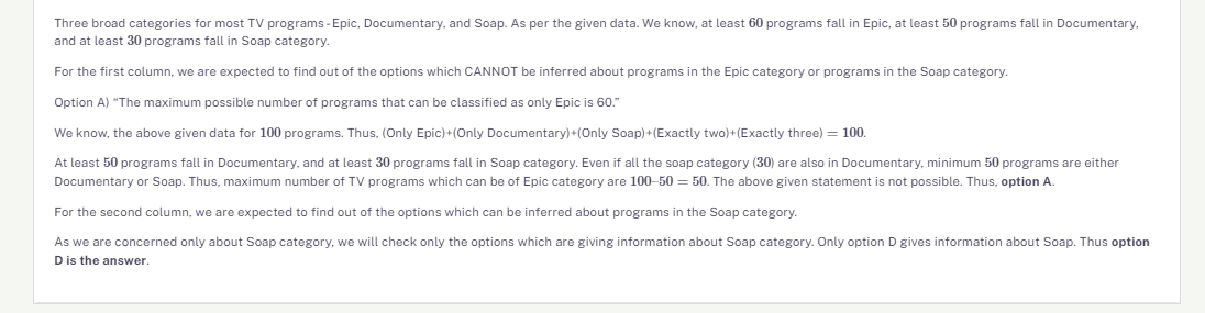 | CANNOT be inferred about programs in the Epic category or programs in the Soap Category | Can be inferred about programs in the Soap category | |
