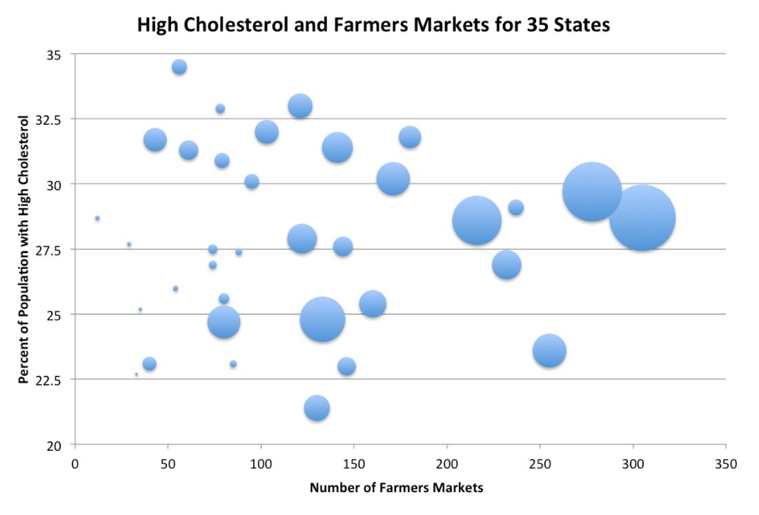 This diagram displays the percent of population that has high cholesterol versus the number of active farmers markets for 35 states in the United States. The size of the bubble gives a visual representation of the population of each state. The smallest bubble represents a population of approximately 600,000, while the largest represents a population of approximately 13 million.