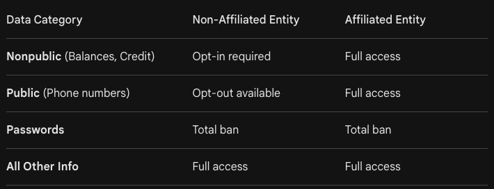 unless a customer explicitly grants permission, no nonpublic information about the customer—e.g., account balances or credit history—can be shared with any non-affiliated institution.'