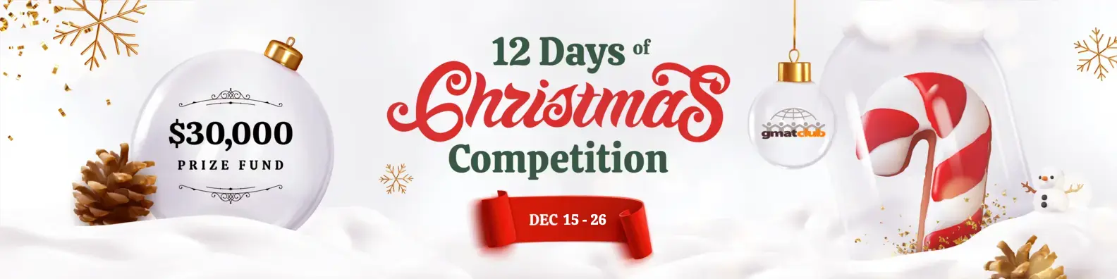 Join us for fun with GMAT questions to help with your prep That's assuming you think solving GMAT questions is funGMAT Club 12 Days of Christmas is a 5th Annual GMAT Club Winter Competition based on solving questions. This is the Winter GMAT competition on GMAT Club with an amazing opportunity to win over