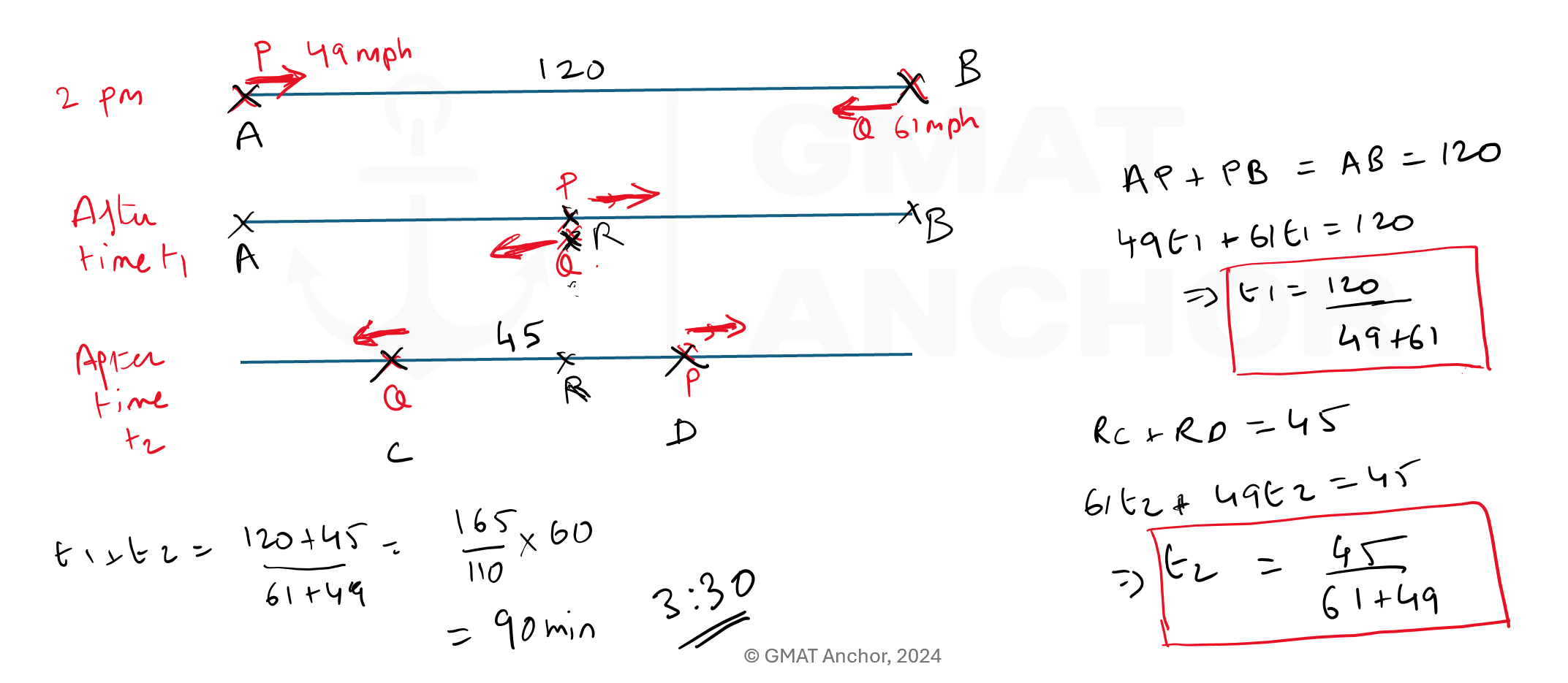 Blackbox, your approach was fine but was not the most efficient method. When the velocities are in opposite directions, we add the velocities, regardless of whether they are approaching head-on or receding in opposite directions. Thus, it is the same pattern for both distances in this problem, so we can just add the distances and divide by the sum of the speeds: