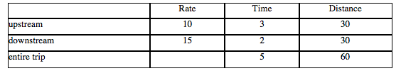 At this point, we can fill in the rest of the chart very straightforwardly. The entire distance is 60. The time taken upstream must be 3, and the time taken downstream must be 2. That makes the entire time 5.