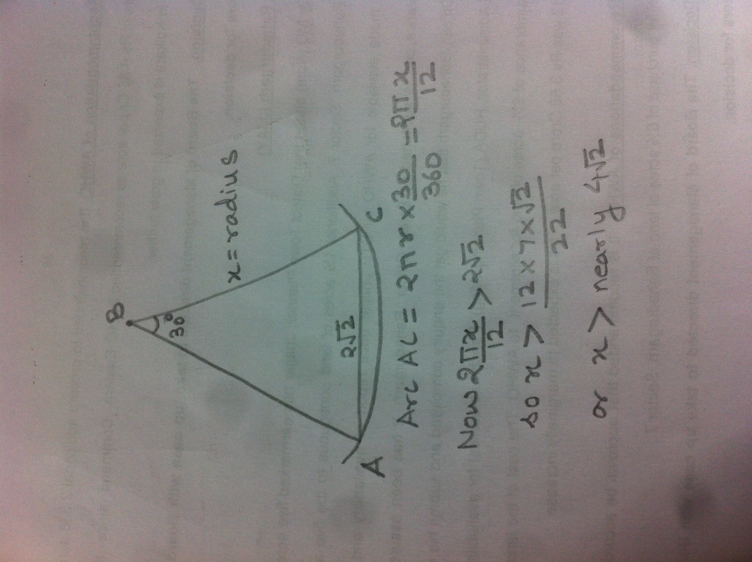 Because \(\angle{B}\) is \(30^{\circ}\), and the side opposite \(\angle{B}\) is \(2\sqrt{2}\), we know that the other two sides, x, will be longer than \(2\sqrt{2}\).
