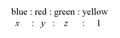 A stack of colored cards is sorted such that x blue cards, y red cards, and z green cards are placed on top of each yellow card, and there are no cards left over.