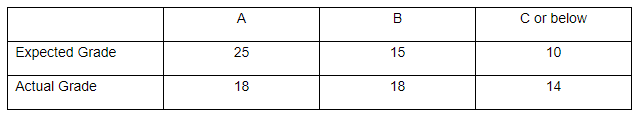 Given: For a class of 50 students, the table above reports the number of students who expected to receive an A, a B, or a C or below as well as the actual number of students who received each grade.