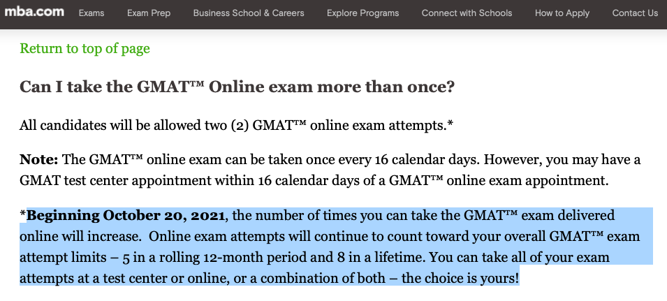 But as you indicated, if the reason we are jumping from 2 online attempts to 5 online attempts is that the question pools are merging and that the online GMAT is now going to be just an at-home delivery of the same test you take at a test center, that will mean the end of this loophole. For now the wording below is the wording on the site, but I gotta believe that the online GMAT is no longer going to have a separate question pool and that this loophole is going to go bye bye.