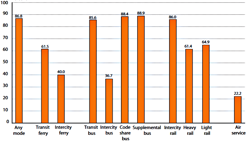 The graph shows the percentages for 9,000 commuter rail stations in Dalvarnie with connections to other modes in communities where both commuter rail and the other mode operate.
