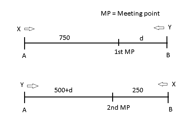 When the boats passed a second time, 250 yards from the "OTHER" shoreline, it means that the same boat that had traveled 750 yards by their first passing has traveled D+250 yards by the second passing [Because it travelled the total distance and then return 250 yards].