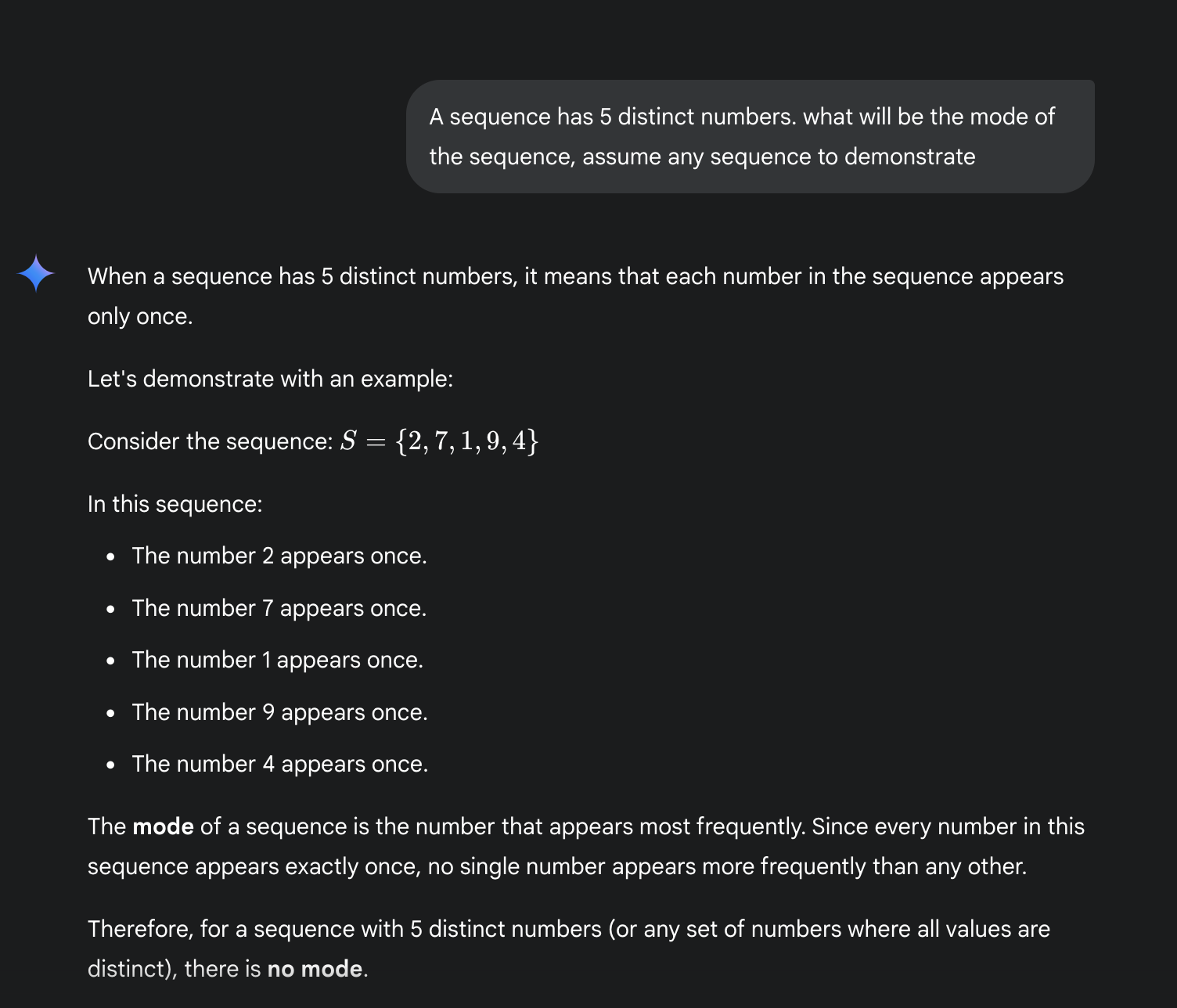 Also, a sequence in which every number appears exactly once has no mode. So for the mode to be 13, 13 has to appear at least twice. Also, if a sequence has more than one mode, we cannot correctly say that the mode of the sequence is 13. We need to say that the modes of the sequences are 13 and say 15.