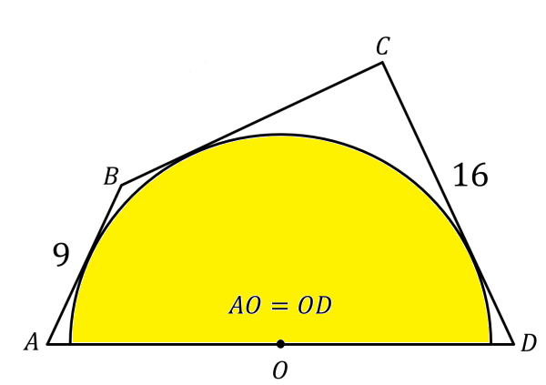 AB, BC and CD are tangent to the yellow semicircle shown above. If O is the center of the circle (part of which the yellow semicircle is), the length of AB is 9 units, the length of CD is 16 units, and AO = OD, then what is the length of AD?