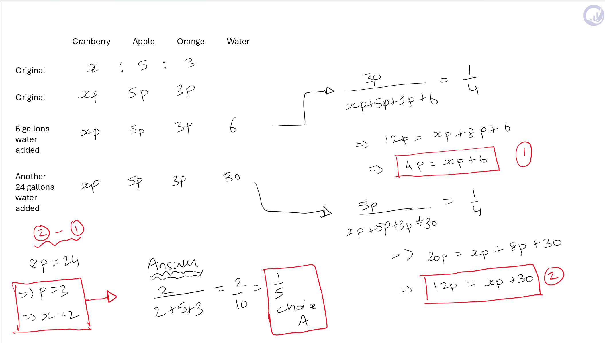 You could notice here, seeing that the "cocktail" becomes 1/4 orange juice after we dilute it, that the original mixture must be more than 1/4 orange juice. So using the x to 5 to 3 ratio, x must be less than 4. But then the ratio of cranberry to the other things is less than 4 to 8, so the original mix is less than 4/12 = 1/3 cranberry, and the answer can only be A or B. If the answer were B, then x turns out not to be an integer -- not impossible, but not likely -- so you could assume the answer is 1/5, and thus that x = 2, and test it to confirm. It turns out to be right, and we have 30 gallons of mixture, with 6 gallons, 15 gallons and 9 gallons of cranberry, apple, and orange respectively.