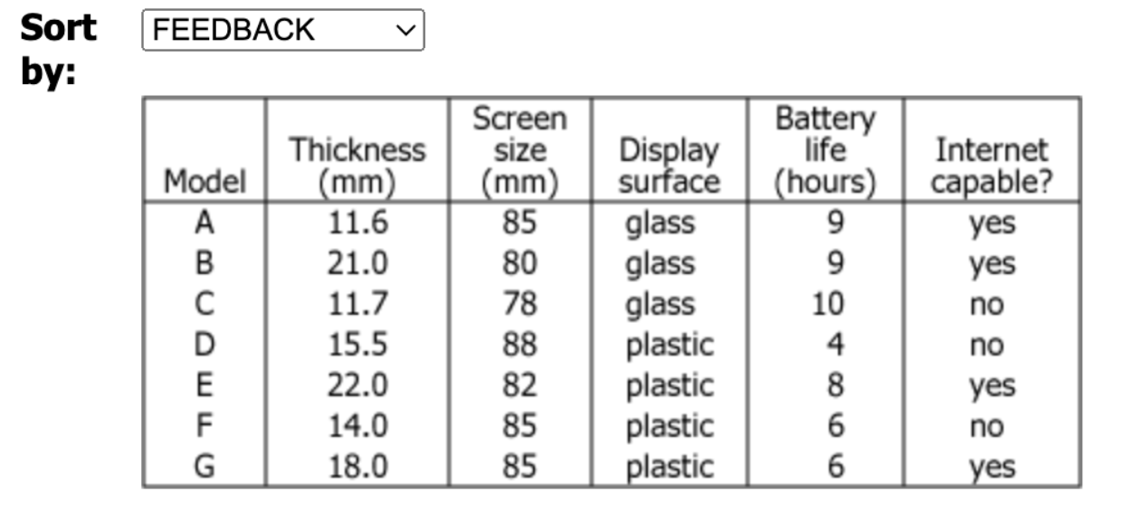 | Model | Thickness (mm) | Screen size (mm) | Display surface | Battery life (hours) | Internet capable? |