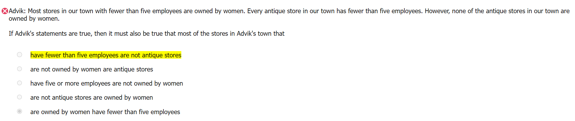 Advik: Most stores in our town with fewer than five employees are owned by women. Every antique store in our town has fewer than five employees. However, none of the antique stores in our town are owned by women.