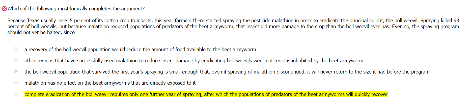E. complete eradication of the boll weevil requires only one further year of spraying, after which the populations of predators of the beet armyworms will quickly recoverThis choice supports the conclusion "the spraying program should not yet be halted."