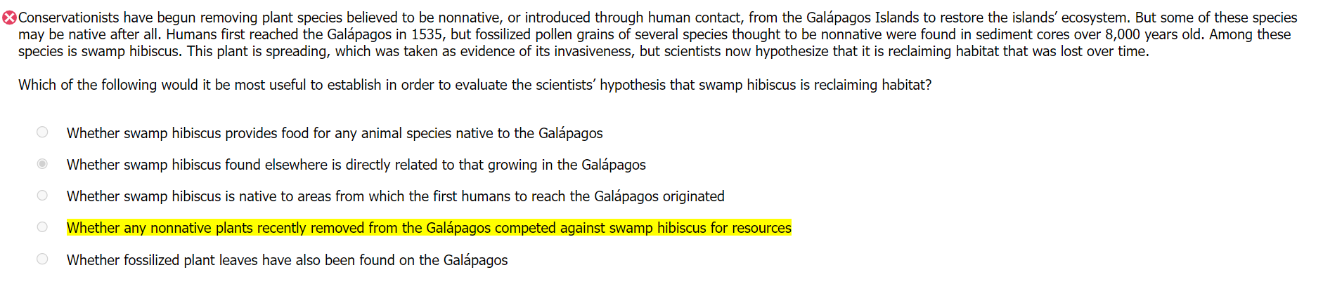 D. Whether any nonnative plants recently removed from the Galápagos competed against swamp hibiscus for resourcesCorrect. We know that non native plants are being removed and swamp hibiscus is spreading. So scientists think that it is reclaiming its own land.