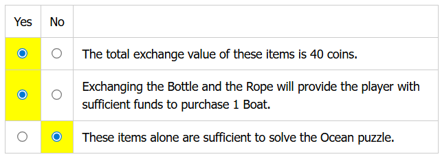 | Exchanging the Bottle and the Rope will provide the player with sufficient funds to purchase 1 Boat. | ||