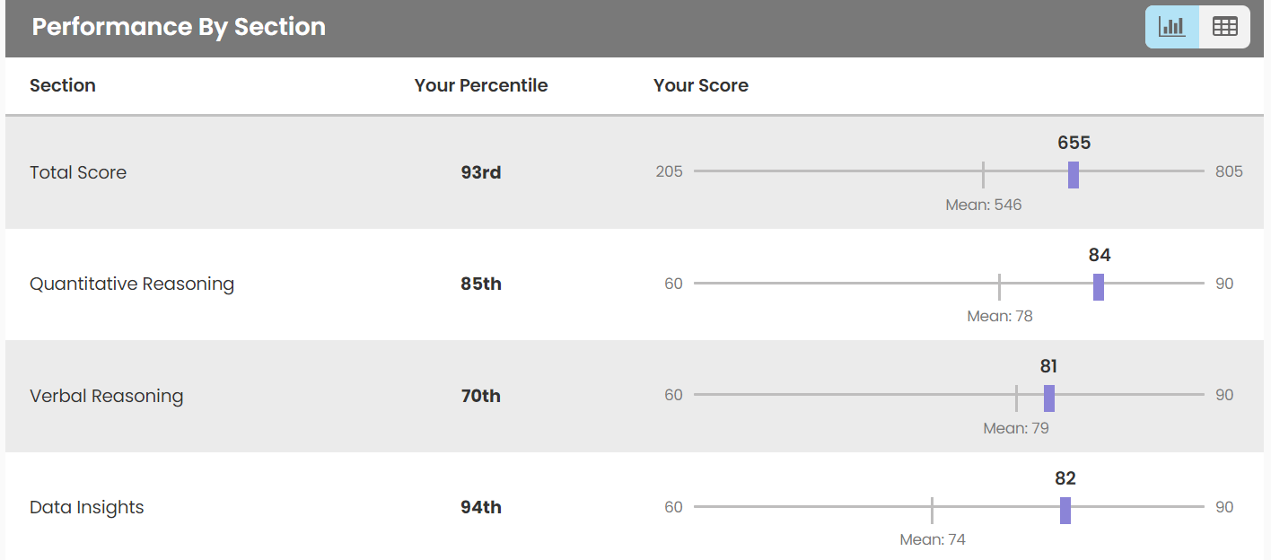My original plan was to take a break after the verbal section, but due to the initial mess-up, I went on to do the Data Insights section without a break, however, managed to score a 94th percentile.
